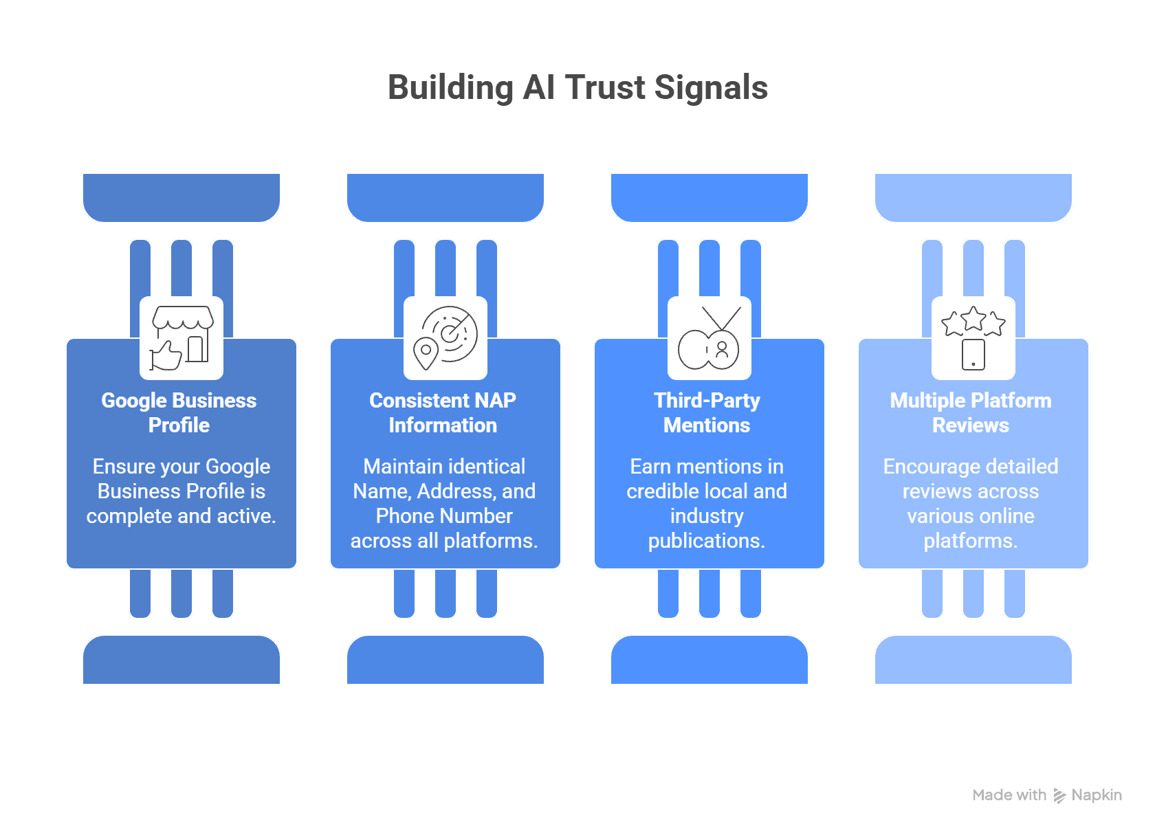 NAP stands for Name, Address, Phone Number. AI systems cross-reference your business information across multiple sources. If your address is listed differently on your website, your Yelp profile, and a local directory, that inconsistency is a trust signal... and not a good one. Audit every place your business appears online and make sure the information is identical.